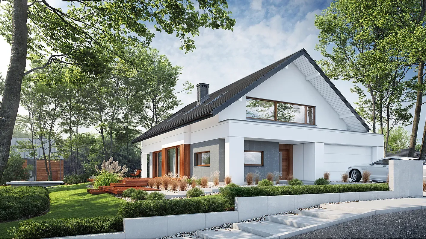 Проект двухэтажного современного дома с двухскатной крышей, покрытой черной керамической черепицей. Фасады дома покрыты белой штукатуркой, что добавляет ему свежести и современности. Элементы облицовки из дерева и бетона создают интересный контраст и добавляют текстуры в дизайн дома.