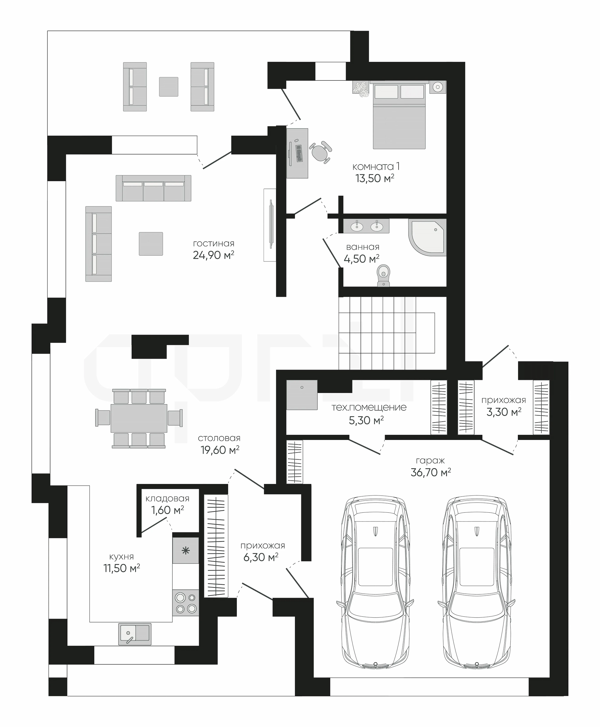 Проект представляет собой современный дом с простыми и чистыми линиями. Общий вид дома выглядит элегантно, современно и функционально.
