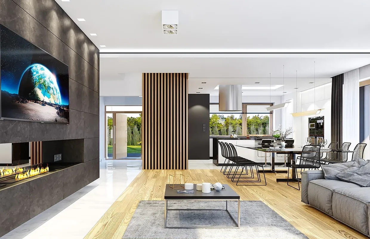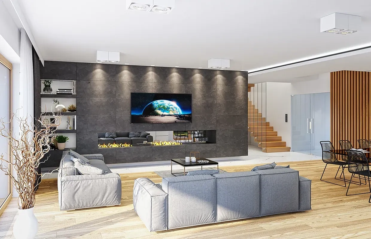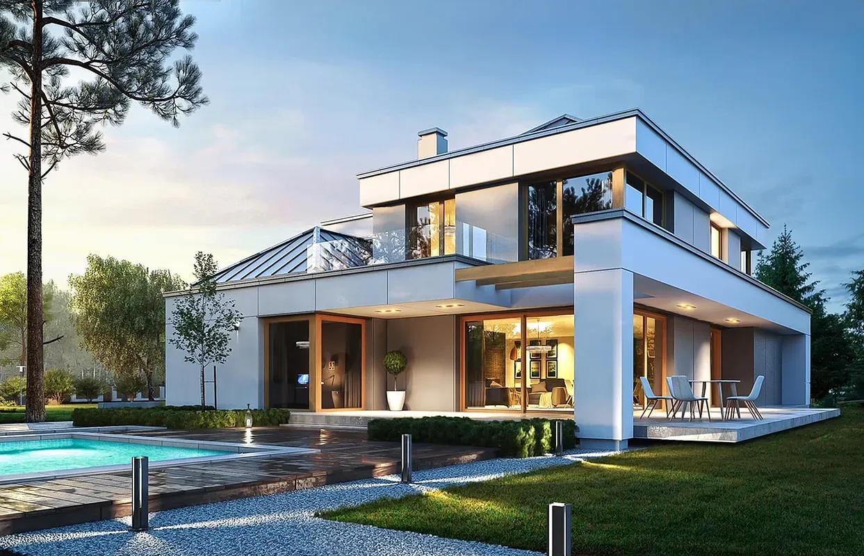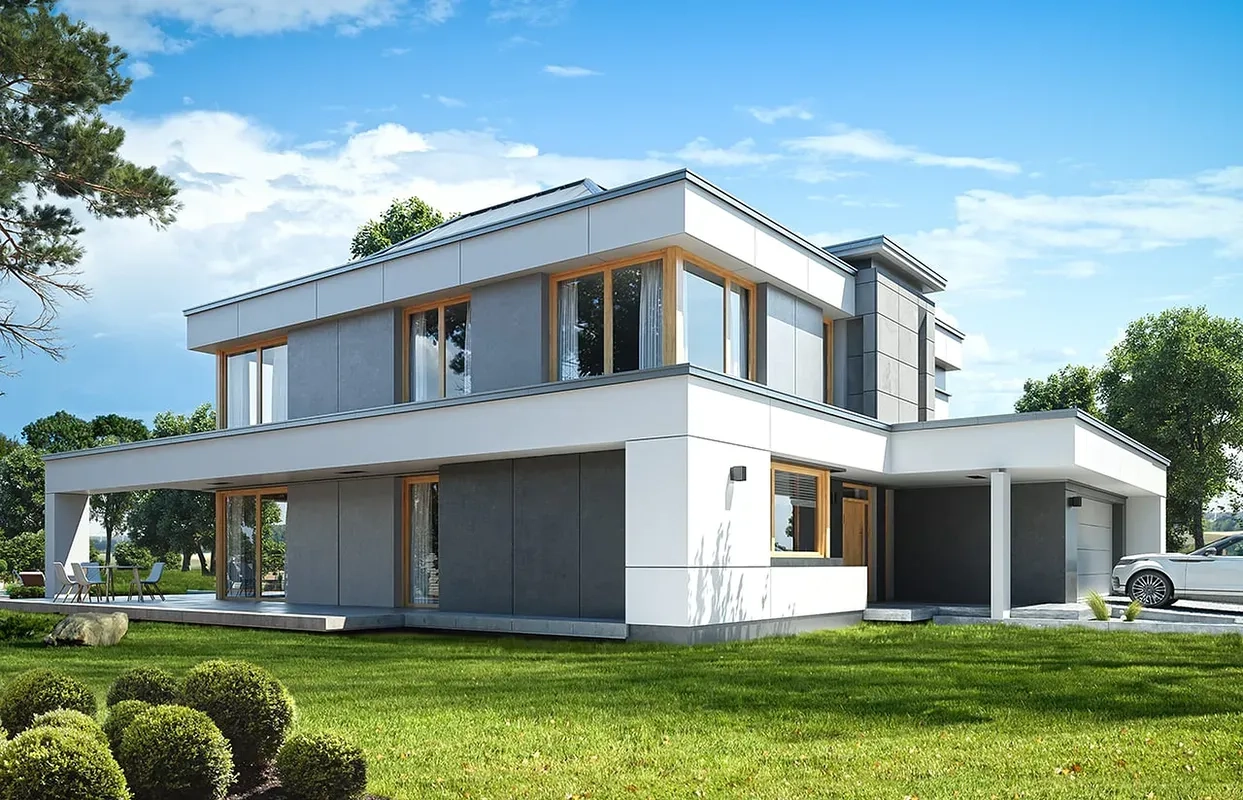 В отделке фасада дома используется преимущественно белый цвет и различные оттенки серой штукатурки, а также натуральный камень.