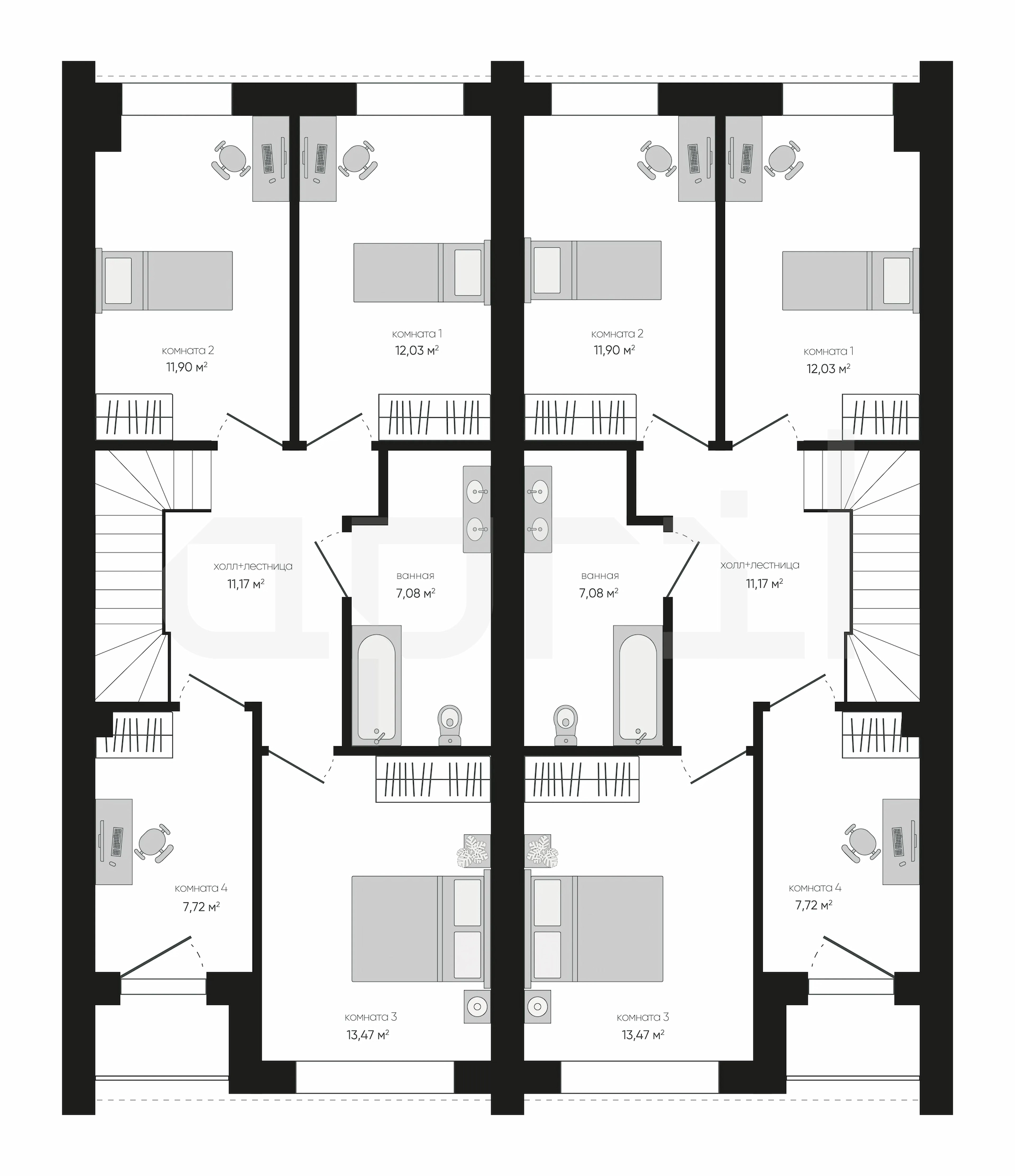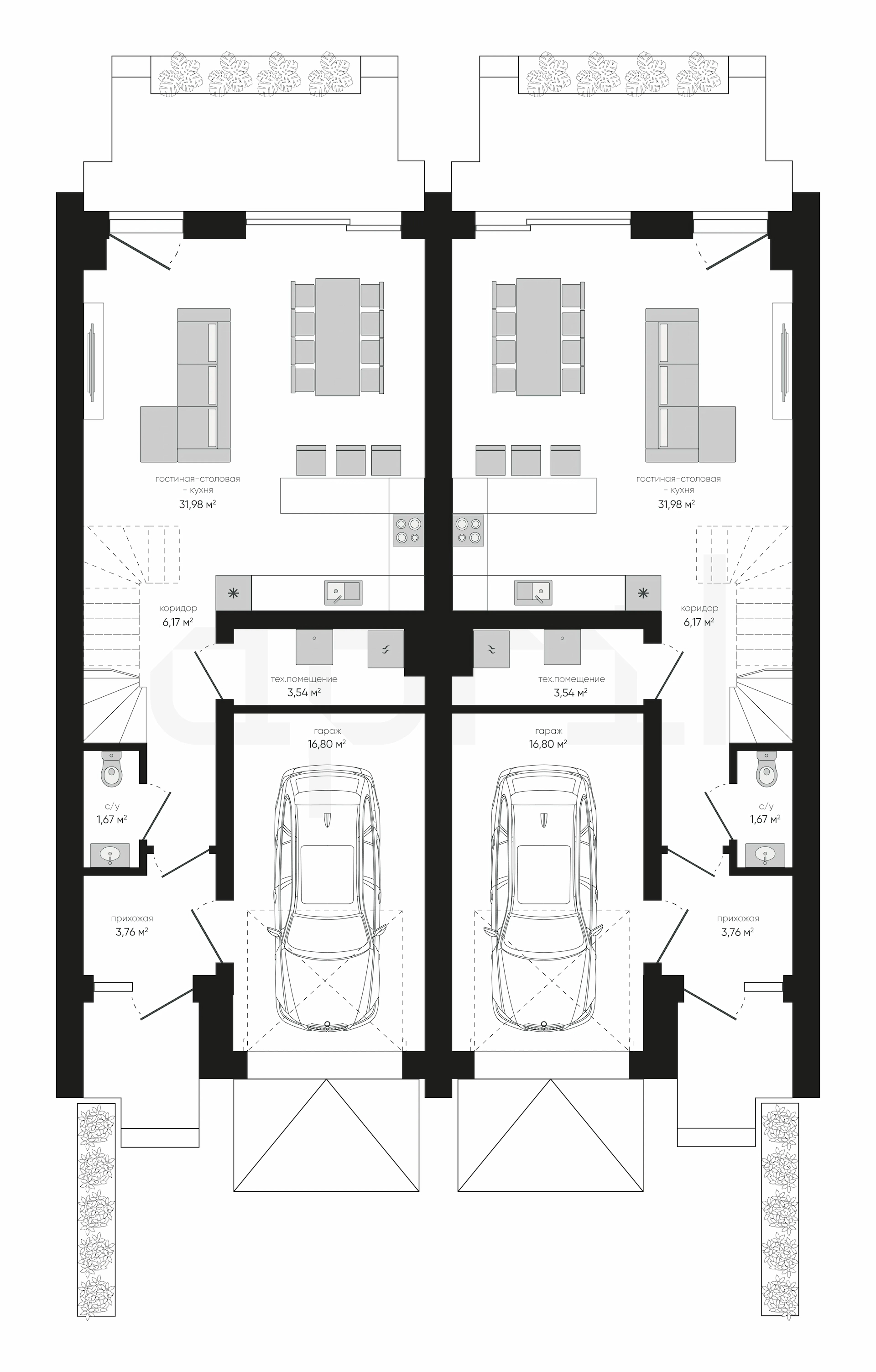 В доме две квартиры с полностью идентичной функциональной планировкой, каждая квартира площадью по 127м². Каждое помещение спроектировано с учетом потребностей двух семей, обеспечивая четкие и удобные раздельные зоны.