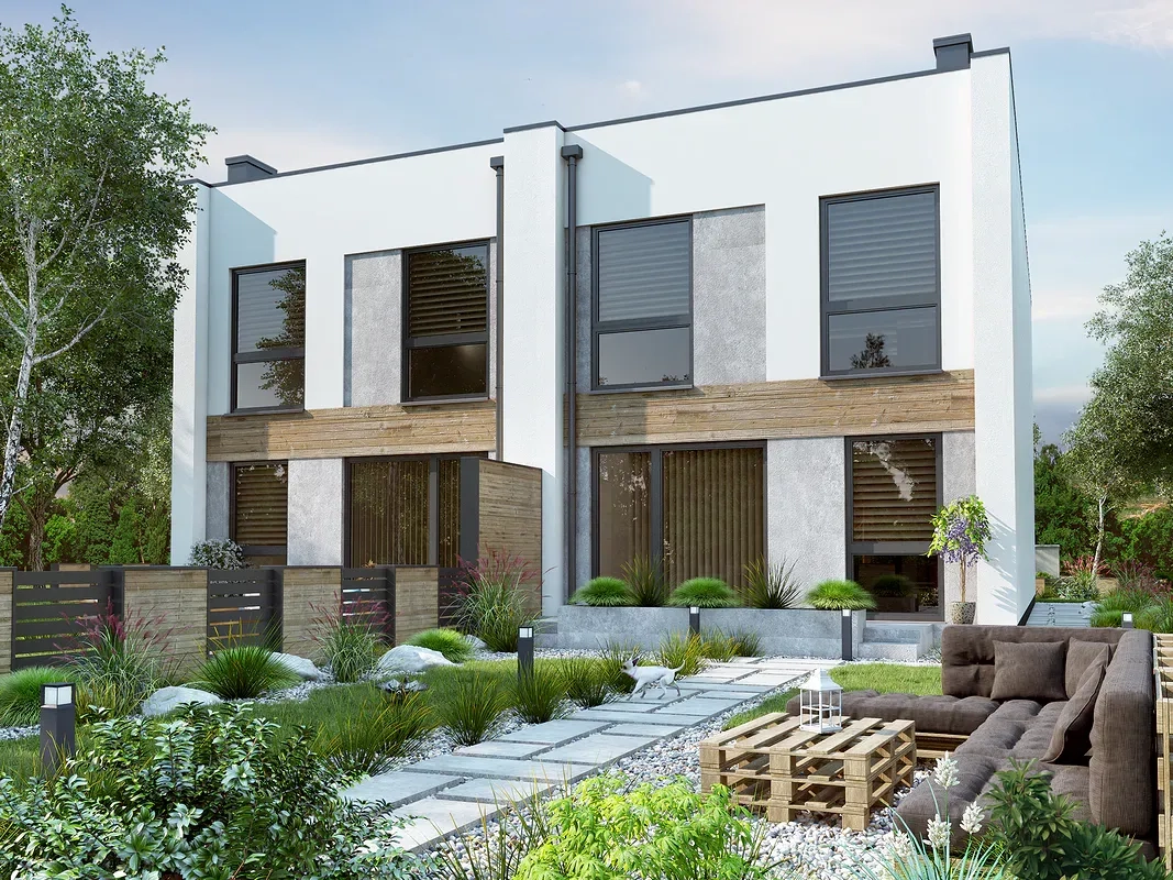Дом представляет собой привлекательный проект двухэтажного двухквартирного дома, который можно заказать как двухквартирный, так и отдельно стоящее здание.