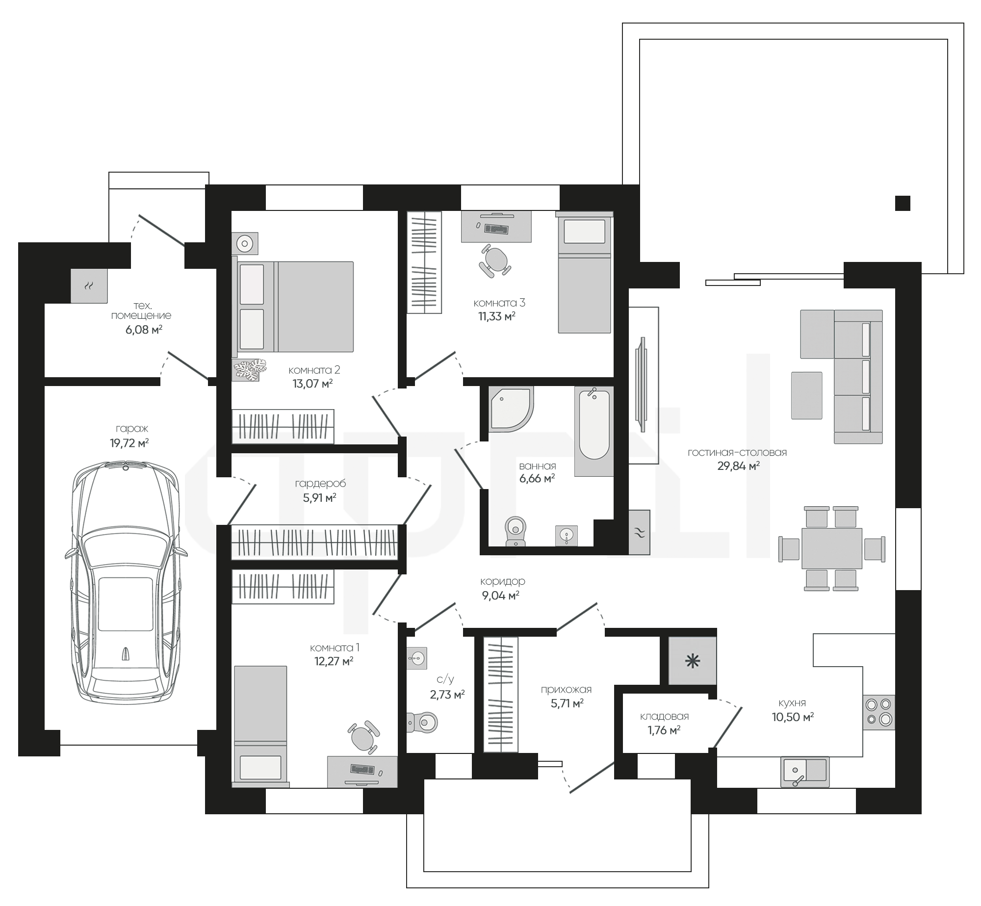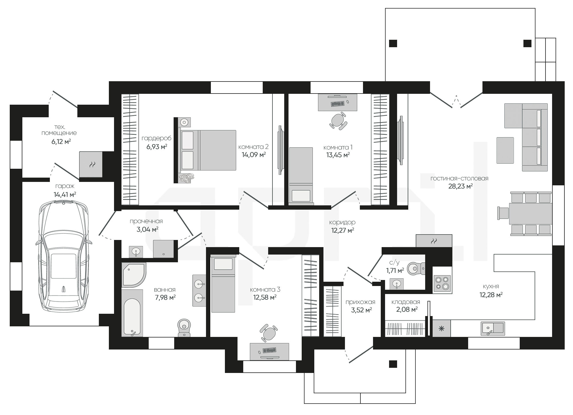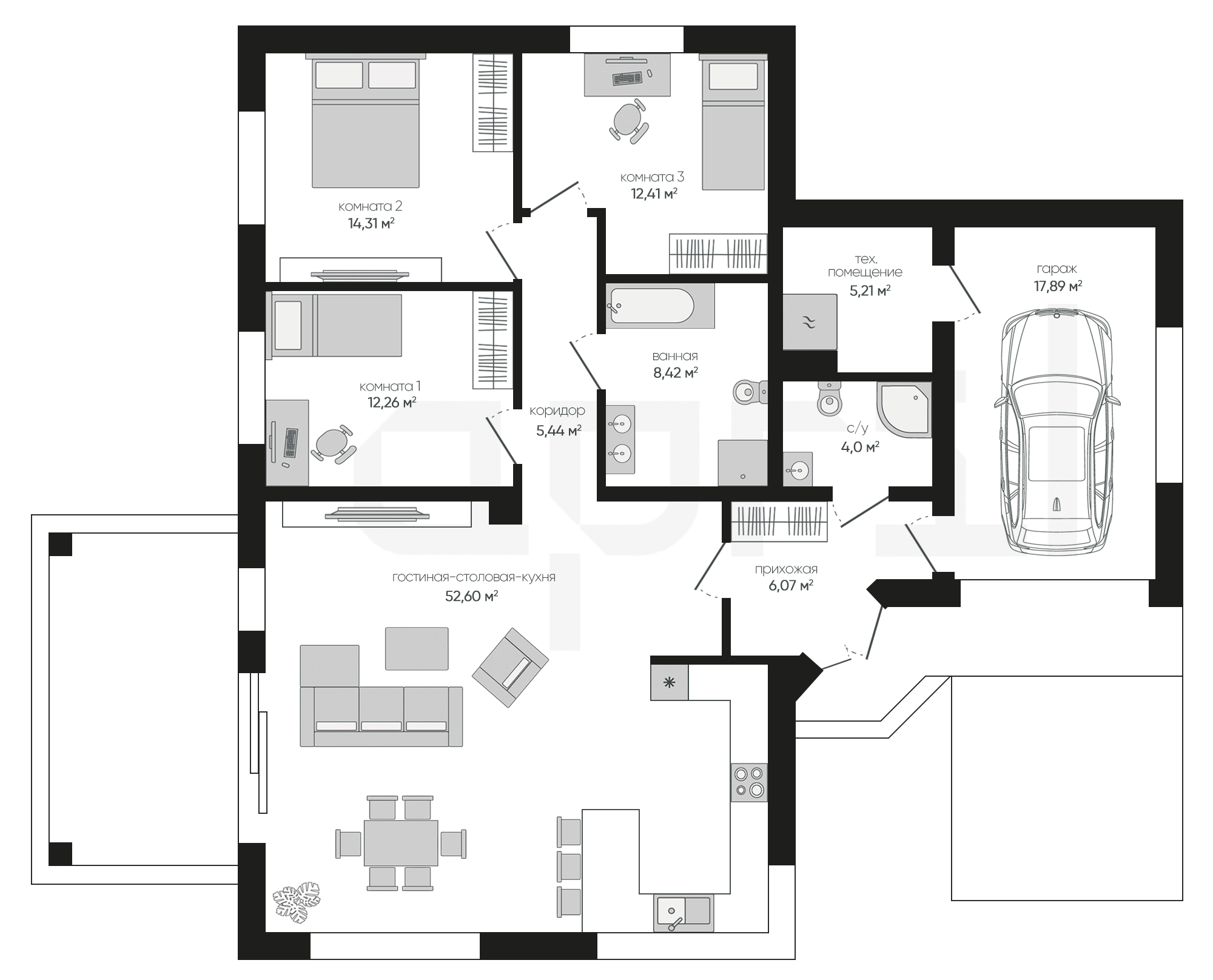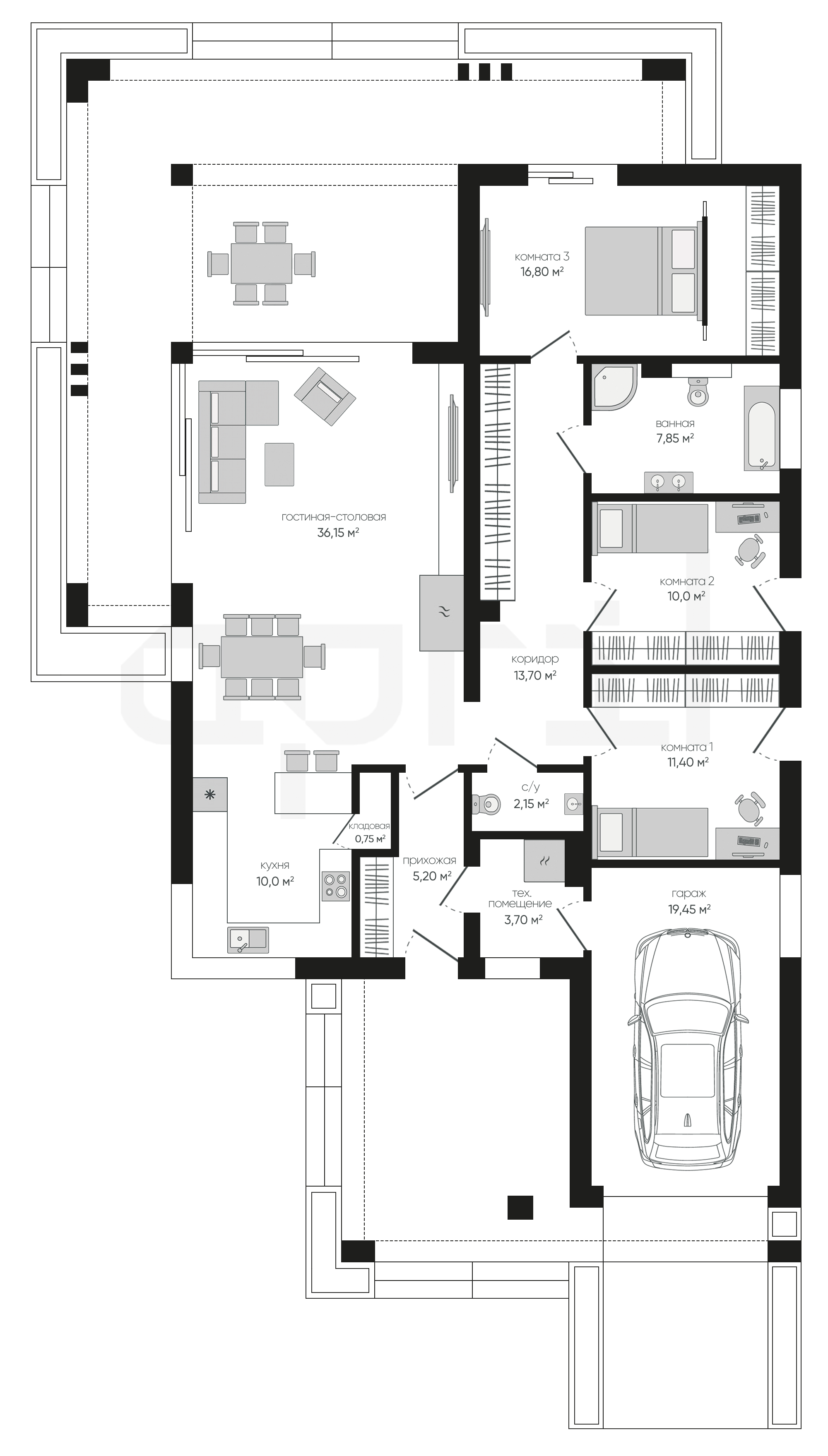 Комплексное решение экономит до 20% бюджета за счет общего фундамента и коммуникаций, при этом обеспечивая комфортный переход из гаража в дом и выход на террасу из гостиной.