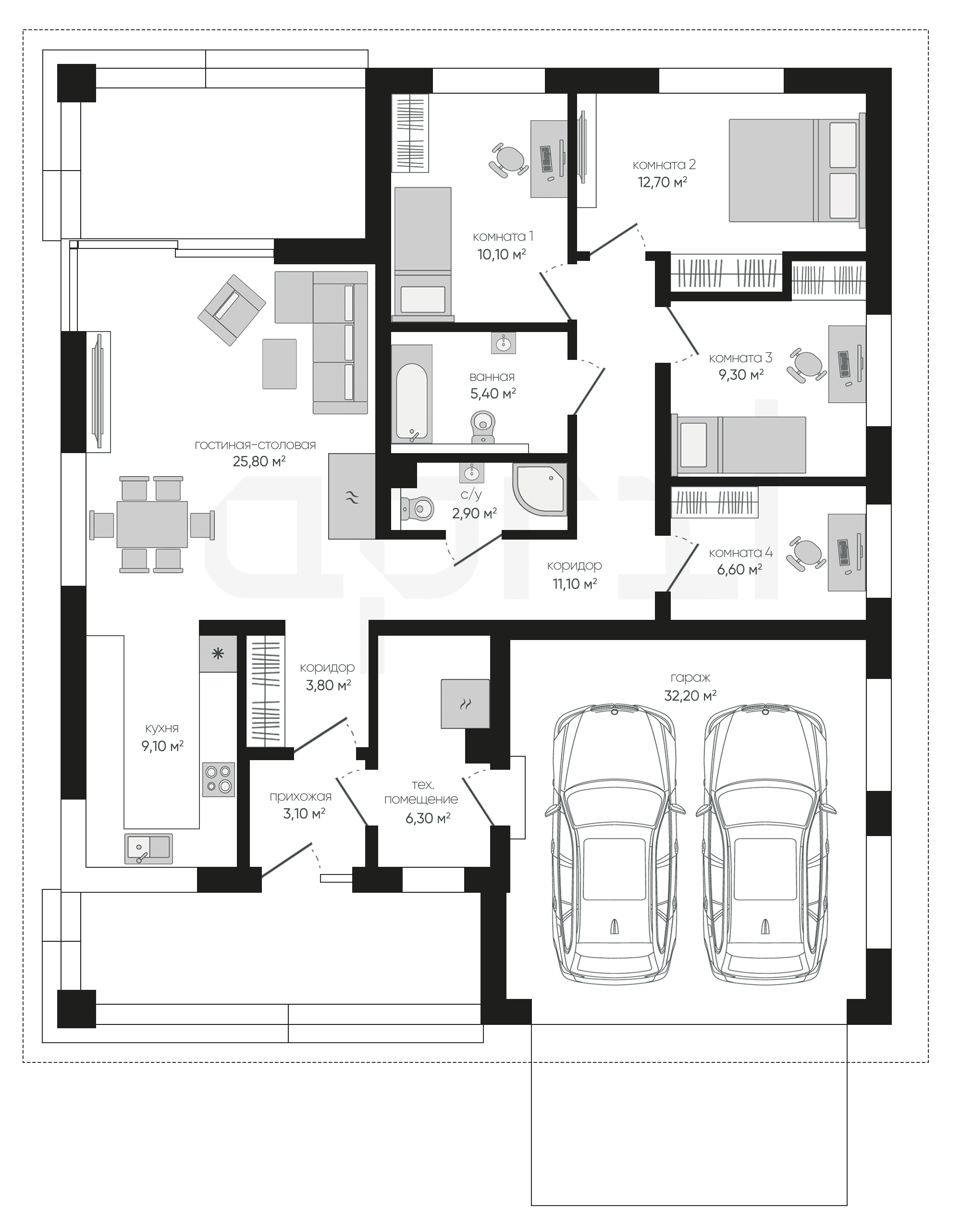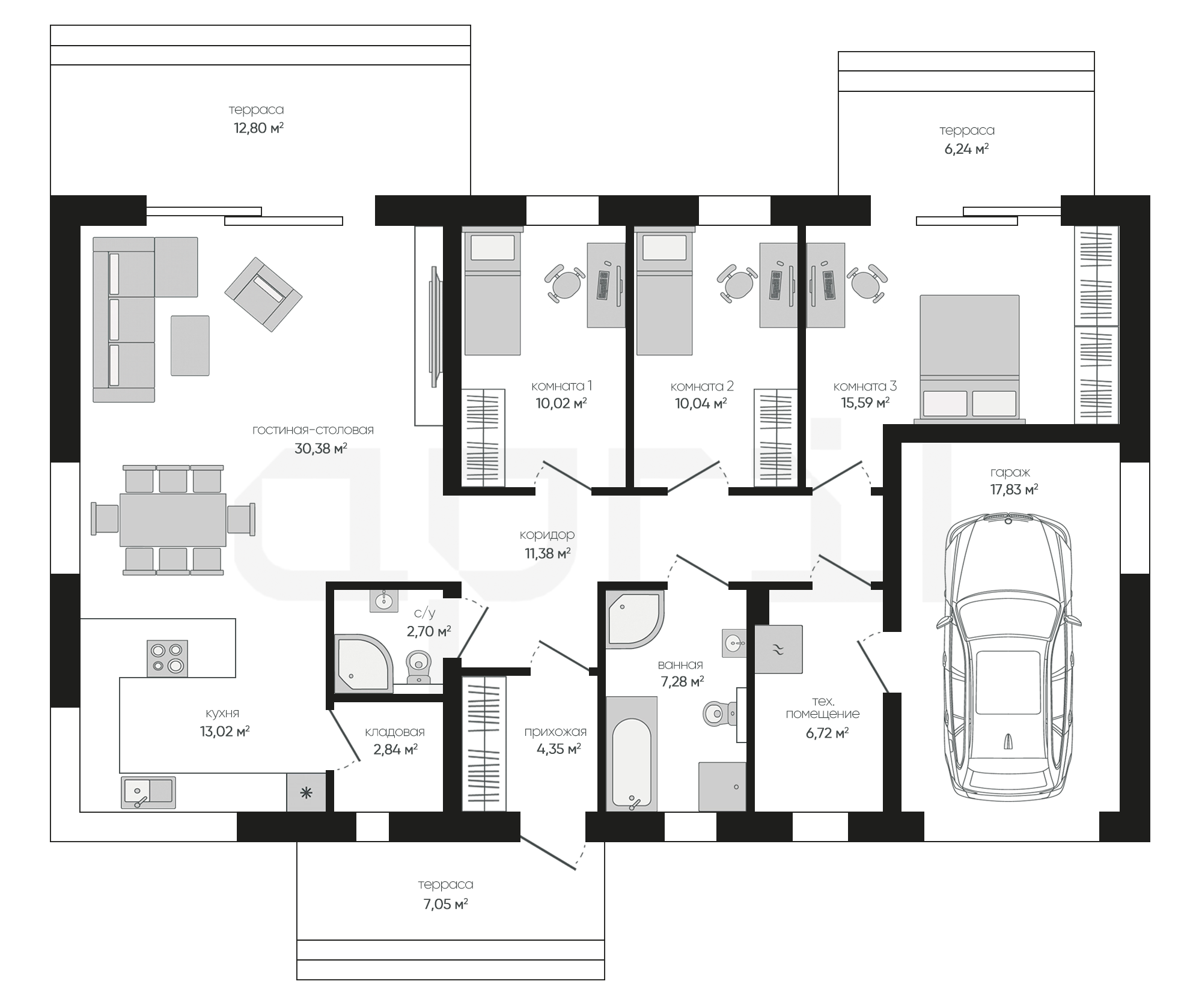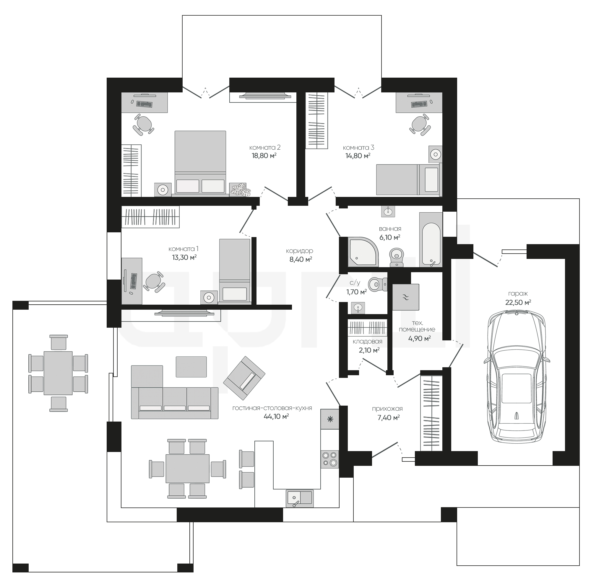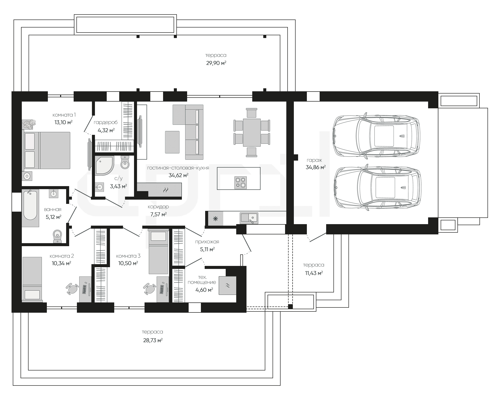 Одноэтажные дома с гаражом и террасой сочетают в себе все необходимое для жизни за городом: безопасность, удобство и эстетику.Идеальный вариант для отдыха: гараж на 1-2 авто + просторная терраса 15-30 м². Дополнительно: летняя кухня, зона барбекю, автоматические маркизы.