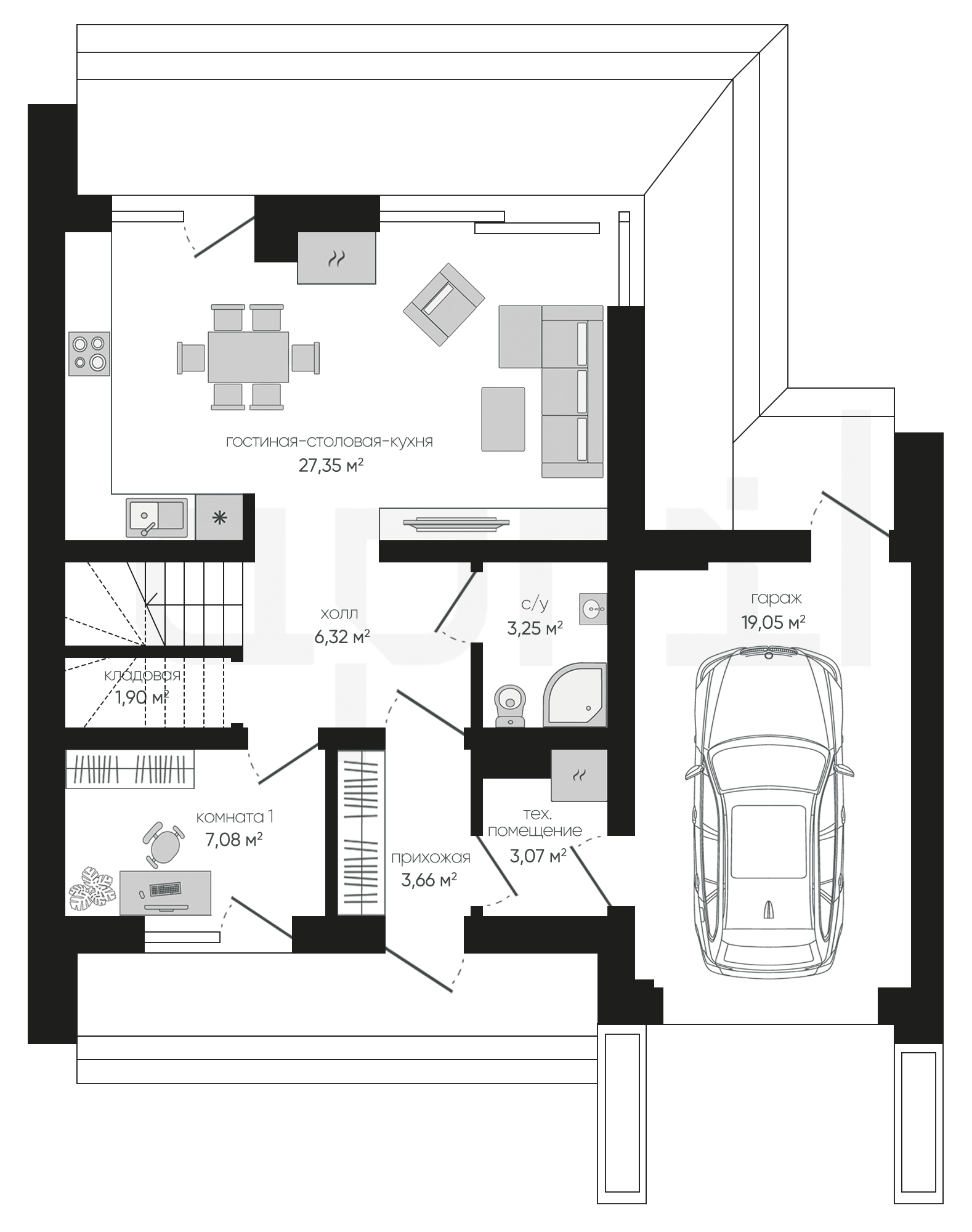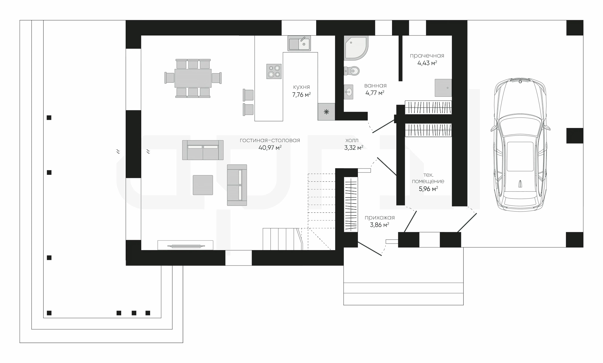 Встроенный гараж экономит место на участке, обеспечивает прямой вход в дом и сохраняет тепло зимой, сокращая расходы на отопление.