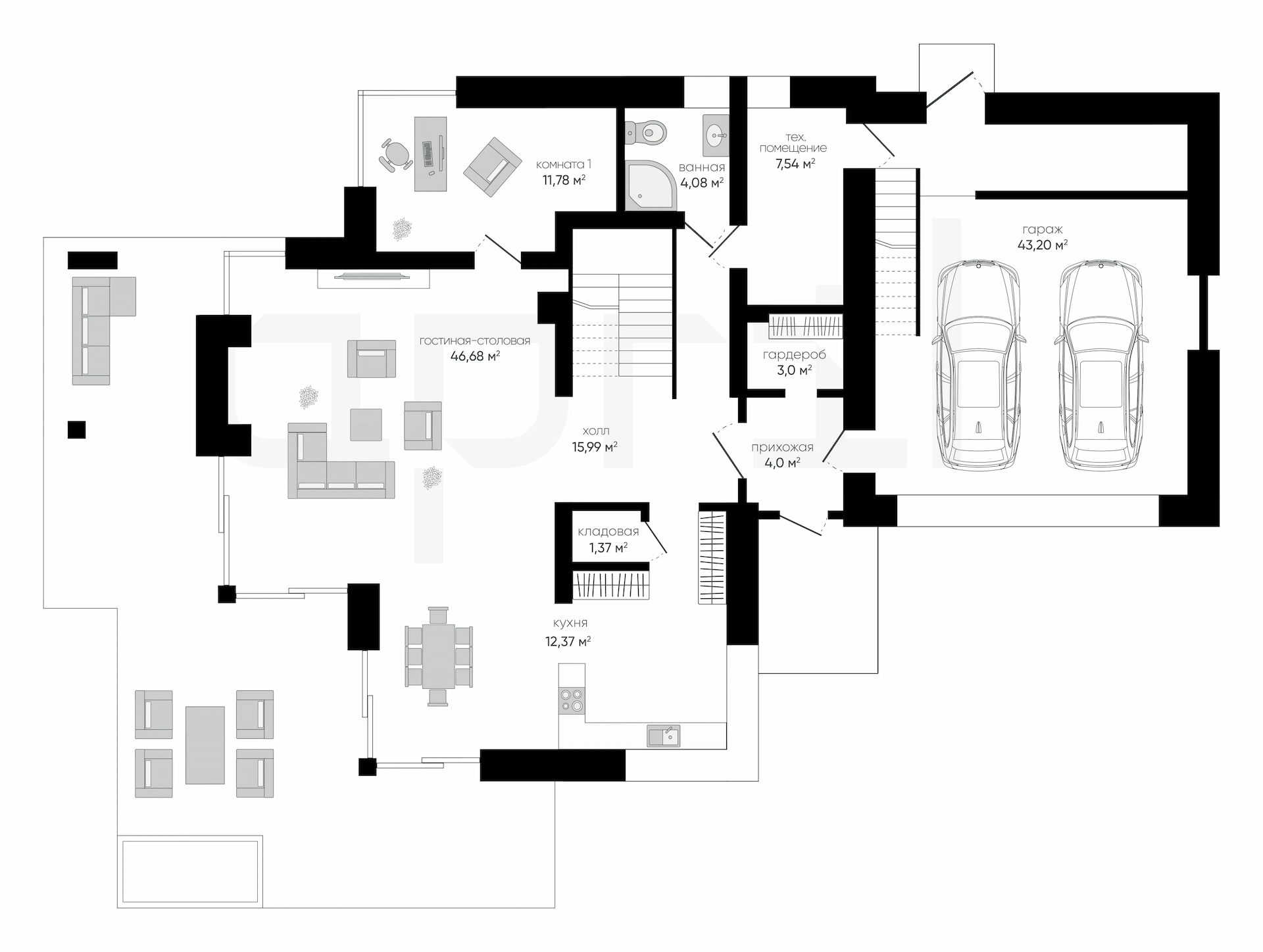 Перетекающие пространства, многоуровневость, встроенная мебель и камины как композиционные центры.